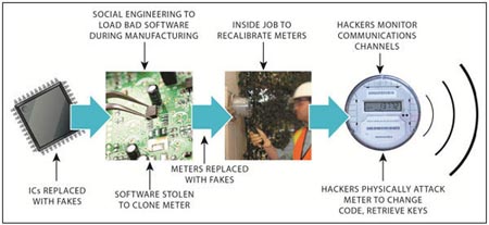 即使掛網(wǎng)的電表都具備一定的保護(hù)措施,可在一定程度上防止篡改。我們?nèi)匀荒軌虬l(fā)現(xiàn)一些容易遭受攻擊的環(huán)節(jié)——生產(chǎn)環(huán)節(jié),所謂的“社交工程”為攻擊者侵入IP和生產(chǎn)流程提供了機(jī)會(huì)�;ㄙM(fèi)數(shù)千美金,攻擊者就有可能獲取程序,通過(guò)逆向工程修改后,將“新程序”植入產(chǎn)品。另外,攻擊者也可以將你的程序出售給競(jìng)爭(zhēng)對(duì)手,造成巨大損失。