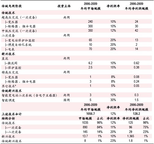 圖表1.傳統(tǒng)電網(wǎng)階段傳統(tǒng)、新興及傳統(tǒng)新興技術(shù)領(lǐng)域主設(shè)備國內(nèi)市場(chǎng)空間和盈利能力估算